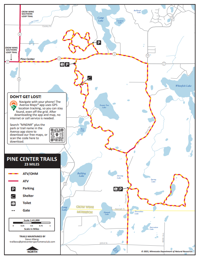 From the Pine Center trailhead, riders can also connect to extended routes leading to the Brainerd area, including the Fort Ripley Trail and Camp Ripley Connection. The trails are maintained by the Pine Center Sportsmen’s Club, with funding provided through the Minnesota Trail Assistance Program, grants, fundraising efforts, and generous donations.